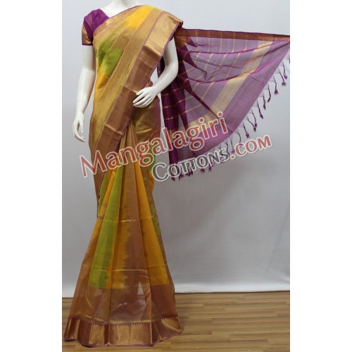 Mangalagiri Handloom Semi Pattu Saree (Cotton Warp + Semi Pattu Weaving) with Gold Zari Border. Saree comes with Unstitched Blouse Piece.