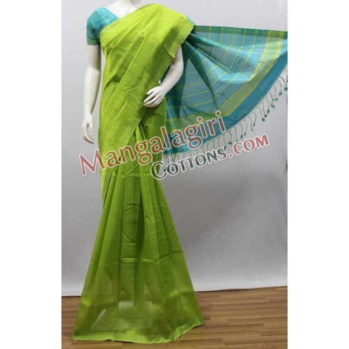 Mangalagiri Handloom Semi Pattu Saree (Cotton Warp + Semi Pattu Weaving) with Silver Zari Lines Plain Border. Saree comes with Unstitched Blouse Piece.