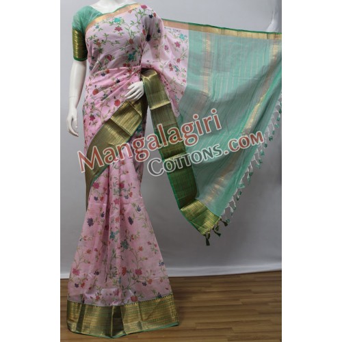 Mangalagiri Handloom Pure Pattu Printed Saree (Cotton Warp + Pure Pattu Weaving) with Gold Zari Border. Saree comes with Unstitched Blouse Piece.