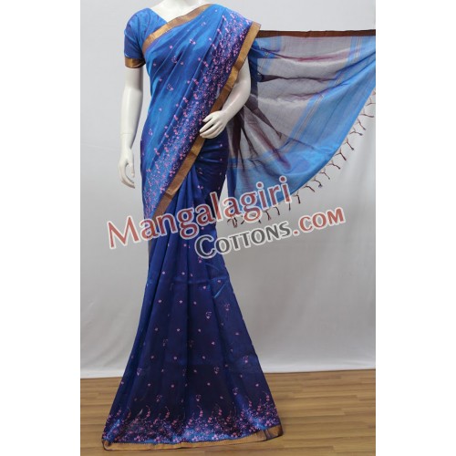 Mangalagiri Handloom Semi Pattu Chikankari Work Saree (Cotton Warp + Semi Pattu Weaving) with Gold Zari Border. Saree comes with Allover Thread Machine Embroidery work and Plain Unstitched Blouse Piece.