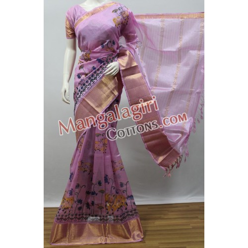 Mangalagiri Handloom Semi Pattu Printed Saree (Cotton Warp +Semi Pattu Weaving) with Gold Zari Border. Saree comes with Unstitched Blouse Piece.