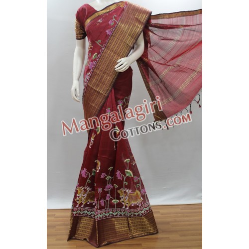 Mangalagiri Handloom Semi Pattu Printed Saree (Cotton Warp +Semi Pattu Weaving) with Gold Zari Border. Saree comes with Unstitched Blouse Piece.
