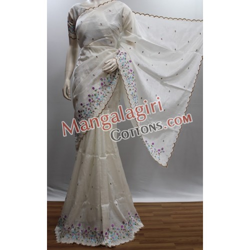 Mangalagiri Handloom Semi Pattu Plain Saree (Cotton Warp + Semi Pattu Weaving) with Thread Border. Saree comes with Allover Thread Machine Embroidery work and Plain Unstitched Blouse Piece.