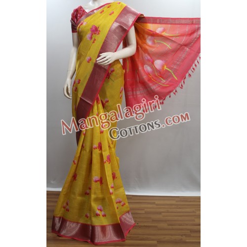 Mangalagiri Handloom Semi Pattu Printed Saree (Cotton Warp +Semi Pattu Weaving) with Silver Zari Border. Saree comes with Unstitched Blouse Piece.