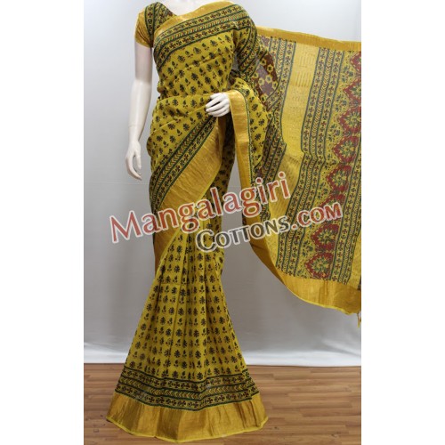 Mangalagiri Handloom Semi Pattu Printed Saree (Cotton Warp +Semi Pattu Weaving) with Gold Zari Border. Saree comes with Unstitched Blouse Piece.