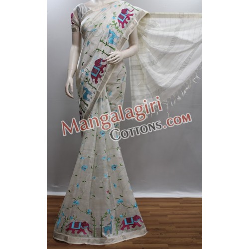 Mangalagiri Handloom Semi Pattu Plain Saree (Cotton Warp + Semi Pattu Weaving) with Silver Zari Border. Saree comes with Allover Thread Machine Embroidery work and Plain Unstitched Blouse Piece.