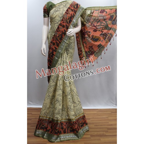 Mangalagiri Powerloom Semi Pattu Printed Saree (Cotton Warp +Semi Pattu Weaving) with Silver Zari Border. Saree comes with Unstitched Blouse Piece.