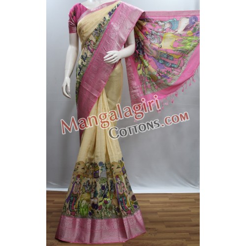 Mangalagiri Handloom Semi Pattu Digital Printed Saree (Cotton Warp +Semi Pattu Weaving) with Silver Zari Border. Saree comes with Unstitched Blouse Piece.