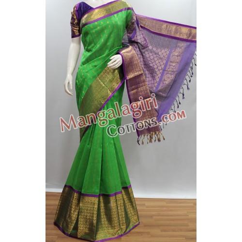Mangalagiri Handloom Semi Pattu Kanchi Saree (Cotton Warp + Semi Pattu Weaving) with Gold Zari Border. Saree comes with Unstitched Blouse Piece.