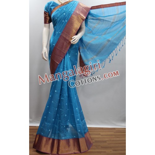 Mangalagiri Handloom Semi Pattu Mirror Work Saree (Cotton Warp + Semi Pattu Weaving) with Gold Zari Border. Saree comes with Unstitched Blouse Piece.