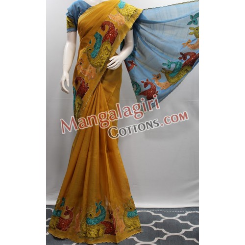 Mangalagiri Handloom Semi Pattu Applique Saree (Cotton Warp + Semi Pattu Weaving) with Scallop Border. Saree comes with Unstitched Blouse Piece.