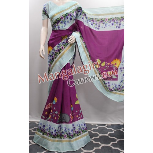 Mangalagiri Powerloom Semi Pattu Digital Printed Saree (Cotton Warp +Semi Pattu Weaving) with Gold Zari Border. Saree comes with Unstitched Blouse Piece.