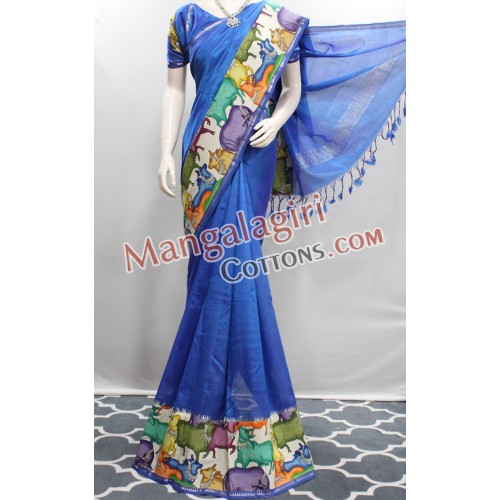 Mangalagiri Handloom Semi Pattu Gap Kalamkari Hand Print Saree (Cotton Warp + Semi Pattu Weaving) Silver Zari Border. Saree comes with Unstitched Blouse Piece.