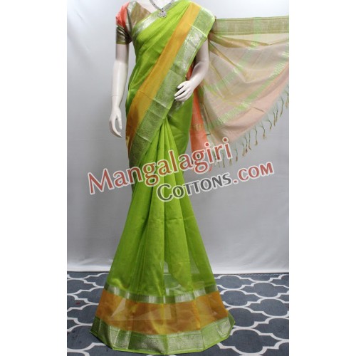 Mangalagiri Handloom Semi Pattu Gap Border Saree (Cotton Warp + Semi Pattu Weaving) with Silver Zari Border. Saree comes with Unstitched Blouse Piece.