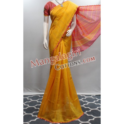 Mangalagiri Handloom Semi Pattu Zari Stipe Saree (Cotton Warp + Semi Pattu Weaving) with Cut Work Border. Saree comes with Unstitched Blouse Piece.