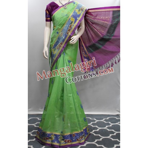 Mangalagiri Handloom Semi Pattu Ikkath Saree (Cotton Warp + Semi Pattu Weaving) with Gold Zari Border. Saree comes with Unstitched Blouse Piece.