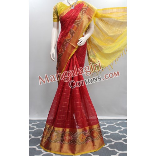 Mangalagiri Handloom Semi Pattu Pochampally Saree (Cotton Warp + Semi Pattu Weaving) with Gold Zari Border. Saree comes with Unstitched Blouse Piece.