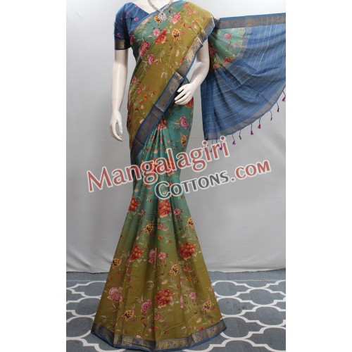 Mangalagiri Powerloom Semi Pattu Digital Print Saree (Cotton Warp +Semi Pattu Weaving) with Gold Zari Border. Saree comes with Unstitched Blouse Piece.