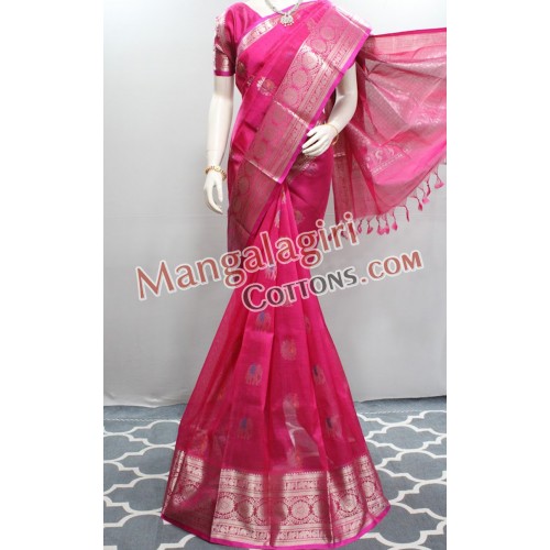 Mangalagiri Handloom Semi Pattu Butta Saree (Cotton Warp + Semi Pattu Weaving) with Silver Zari Border. Saree comes with Unstitched Blouse Piece.