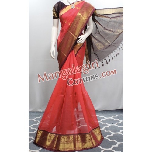 Mangalagiri Handloom Semi Pattu Butta Saree (Cotton Warp + Semi Pattu Weaving) with Gold Zari Border. Saree comes with Unstitched Blouse Piece.