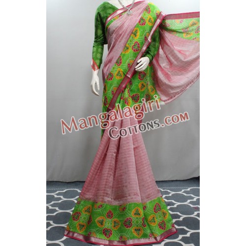 Mangalagiri Handloom Semi Pattu Digital Printed Saree (Cotton Warp + Semi Pattu Weaving) with Silver Zari Border. Saree comes with Running Blouse and Extra 1meter Digital Blouse.