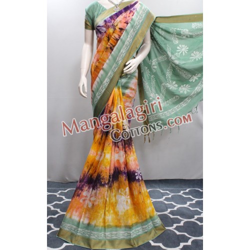 Mangalagiri Powerloom Semi Pattu Nizam Shibori Saree (Cotton Warp +Semi Pattu Weaving) with Gold Zari Border. Saree comes with Unstitched Blouse Piece.