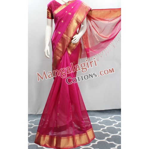 Mangalagiri Handloom Maheshwari Silk Saree (Cotton Warp + Semi Pattu Weaving) with Gold Zari Border. Saree comes with Unstitched Blouse Piece.