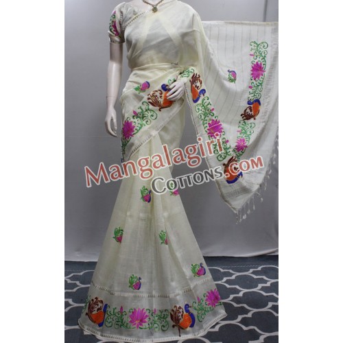 Mangalagiri Handloom Semi Pattu Hand Paint Tanjore Saree (Cotton Warp +Semi Pattu Weaving) with Silver Zari Border. Saree comes with Unstitched Blouse Piece.