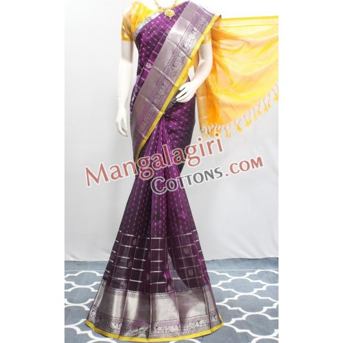 Mangalagiri Handloom Semi Pattu Butta Saree (Cotton Warp + Semi Pattu Weaving) with Silver Zari Border. Saree comes with Unstitched Blouse Piece.