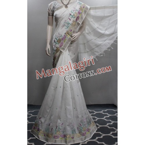 Mangalagiri Powerloom Semi Pattu Embroidary Work Saree (Cotton Warp +Semi Pattu Weaving) with Silver Zari Border. Saree comes with Unstitched Blouse Piece.