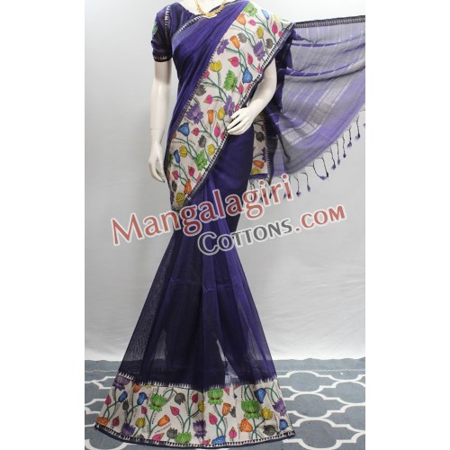Mangalagiri Handloom Semi Pattu Gap Pen Kalamkari Hand Print Work Saree (Cotton Warp + Semi Pattu Weaving) with Silver Zari Border. Saree comes with Unstitched Blouse Piece.