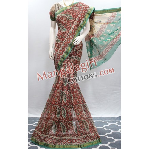 Bagru Maheswari Silk Kalamkari Printed Saree (Cotton Warp + Semi Pattu Weaving) with Gold Zari Border. Saree comes with Unstitched Blouse Piece.