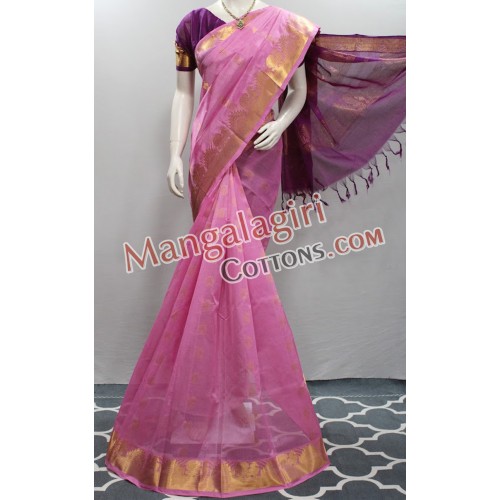 Mangalagiri Handloom Semi Pattu Butta Saree (Cotton Warp + Semi Pattu Weaving) with Gold Zari Border. Saree comes with Unstitched Blouse Piece.
